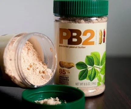 Powdered peanut butter is made by squeezing the oil out of roasted peanuts. When you're ready to eat it, you mix a little bit of water and you get the same consistency as full-fat peanut butter. Regular peanut butter is roughly 200 calories and 16grams of fat per 2 Tbs. Powdered peanut butter weighs in at only 45 calories and 1.5 grams of fat for the same portion!